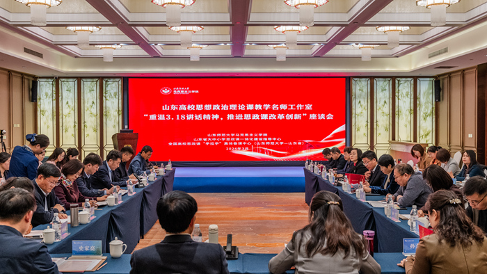 在习近平总书记在学校思想政治理论课教师座谈会上发表重要讲话精神五周年之际,3月17日,山东高校思想政治理论课教学名师工作室“重温3.18讲话精神,推进思政课改革创新”座谈会在山东师范大学举行。座谈会由山东师范大学马克思主义学院、山东省大中小学思政课一体化建设指导中心和全国高校思政课“手拉手”集体备课中心(山东师范大学—山东省)共同举办。山东省教育厅(省委教育工委)思政处(宣教处)处长陈成标出席座谈会并讲话,山东师范大学党委副书记万光侠出席座谈会并致辞,山东高校思政课教学名师工作室主持人、部分专家学者、思政课教学骨干和研究生共50余人参加了研讨交流。座谈会开幕式由山东师范大学马克思主义学院院长王增福主持。