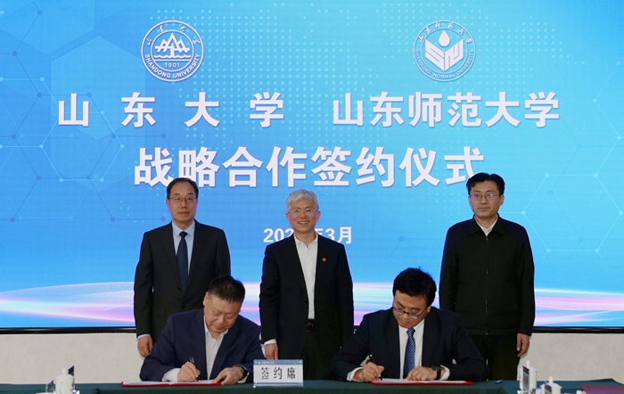 3月27日,山东师范大学与山东大学战略合作协议签约仪式在千佛山校区文化楼四层会议厅举行。山东大学校长、中国工程院院士李术才,副校长芦延华;山东省教育厅总督学王浩;山东师范大学党委书记冯继康、校长张建及在校的校领导参加签约活动。仪式由山东师范大学党委副书记万光侠主持。