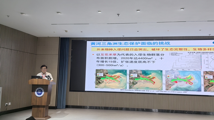 主旨报告环节,张建围绕“黄河三角洲湿地生态修复与效能评估”主题向与会专家介绍了黄河三角洲湿地长期面临生态缺水、外来物种入侵和自然灾害等多重挑战,为了应对这些挑战开展了一系列生态修复重大工程,包括生态补水、水系连通、潮沟清淤以及微地形重塑和鸟类栖息岛等。针对黄河三角洲湿地水生生物评估存在的技术难题,研究团队构建了涵盖60种鱼类的本地鱼类基因图谱,并通过“滤膜-沉淀偶联”将eDNA回收率提升近3倍,有效揭示了鱼类、底栖动物、浮游生物群落多样性响应特征,阐明了黄河三角洲湿地生态修复对物种多样性和生态系统稳定性的积极影响。