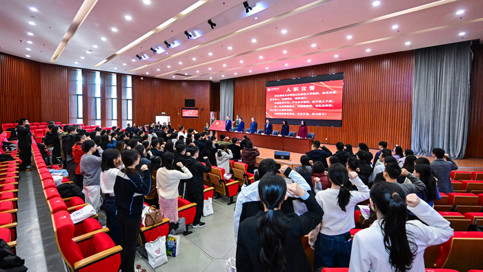 开班式上,学校领导为新聘教师代表佩戴校徽并赠送书籍和教具。全体新聘教师在李宗刚教授的带领下面向国旗庄严宣誓,用铿锵有力的声音做出了师大教师的庄严承诺。
