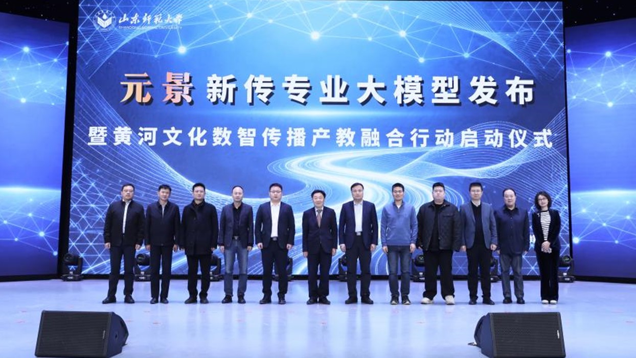 1月22日,由山东师范大学与山东数字文化集团联合主办的“元景”新传专业大模型发布暨黄河文化数智传播产教融合行动启动仪式在长清湖校区举行。校党委副书记万光侠,山东数字文化集团党委书记、董事长魏传强出席活动并致辞。中央民族大学教授、博士生导师郭全中、中国新闻社山东分社视频部主任王峰、山东智慧译百信息技术有限公司CEO江心波、济南国际传播中心负责人刘钦涛,以及新闻与传媒学院相关同志、师生代表参加活动。