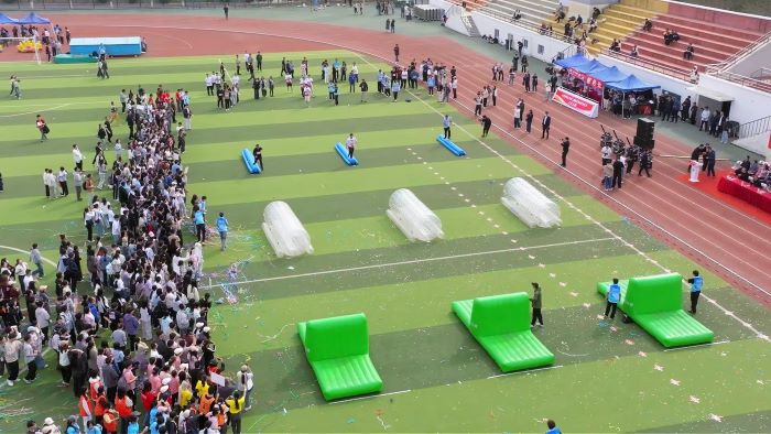 本次运动会共设置“同舟共济”“同心律动”“趣味套圈”“托球跑接力”“旋风跑”“足球九宫格”“步步高升”“搭桥过河”“勇攀高峰”9个团体项目,另设有“大力锤”“迷你高尔夫”“趣味射箭”等体验项目,共有25个研究生培养单位的246支导学团队参加。赛场上,各团队团结协作、奋勇争先,通过队旗、队服、横幅、口号等多种形式,生动展现了昂扬向上的团队文化与学术风貌。现场还开展了“一卷传薪火 导学绘芳华——研究生导学文化长卷绘制活动”。