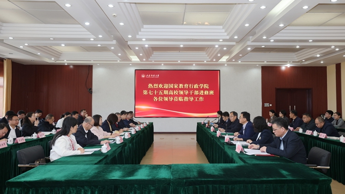 4月2日,国家教育行政学院第七十五期高校领导干部进修班来校调研。国家教育行政学院高校管理教研部副主任陈霞玲,校党委书记冯继康,党委副书记万光侠,党委常委、副校长周珊珊、李娜、魏学江出席座谈会。校长张建主持会议。